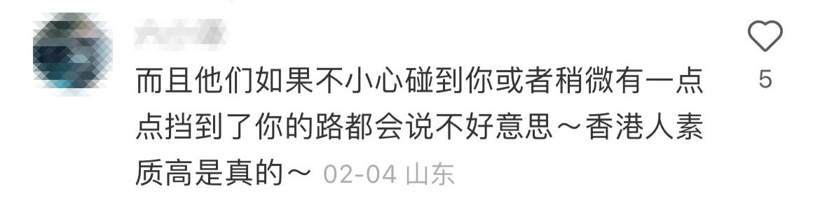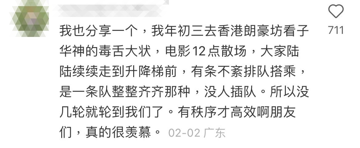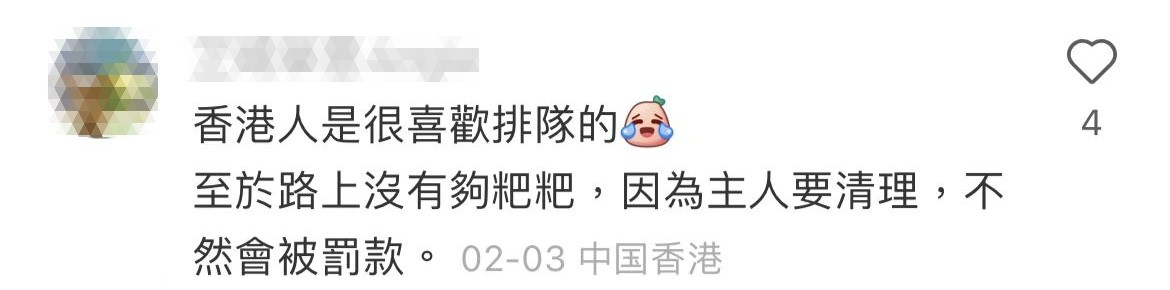 小紅書圖片。 最後一點是馬路環境。樓主說,雖然香港馬路大部分很舊,地上陳年老垢髒髒的,也有不少垃圾,但她從來沒有見到狗糞。樓主笑說,雖然不排除自己眼神不好沒看到,但自己有特意觀察了。“因為我自己是養狗人士,前幾周我從(上海)長寧路凱旋路步行至長寧路古北路(1.7公里左右),路上看到起碼10個狗粑粑(狗糞)。很多已經踩扁了,甚至有幾次我用自帶的撿屎袋撿過陌生狗狗的糞便” 樓主最後總結時指,或許因為大家的生活環境不同,所以習慣也不同。“我最愛的肯定是我的家鄉上海,但就覺得其他地方的人的優點我們應該學習一下。 帖文引起不少網民討論,特別是在排隊這一方面。有人分享自己在香港遊玩的經驗,”年初三在香港看電影,電影12點散場,大家陸陸續續走到升降機前,有條不紊排隊搭乘,是一條隊整整齊齊的那種,沒人插隊。所以沒幾輪就輪到我們了。有秩序才高效啊朋友們,真的很羨慕了”