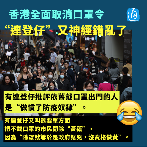 香港新聞網3月2日電 昨天(3月1日)起,香港全面取消口罩令,香港市民與相伴近三年的口罩說“再見”。多數市民表示歡迎,對經濟前景亦表樂觀,也有不少市民依舊戴口罩出門,有人笑言戴習慣了,不戴似裸奔。 與普通市民的平常樂觀心態相比,在連登論壇上的“連登仔”們似乎神經錯亂了一般,他們有的批評依舊戴口罩出門的人是“做慣了防疫奴隸”,有的又叫囂要把不戴口罩的人開除“黃籍”,因為“除罩就等於是政府幫凶,沒資格做黃”。網友嘲諷道:把這兩波“連登仔”約在一起,不知會有什麼效果!