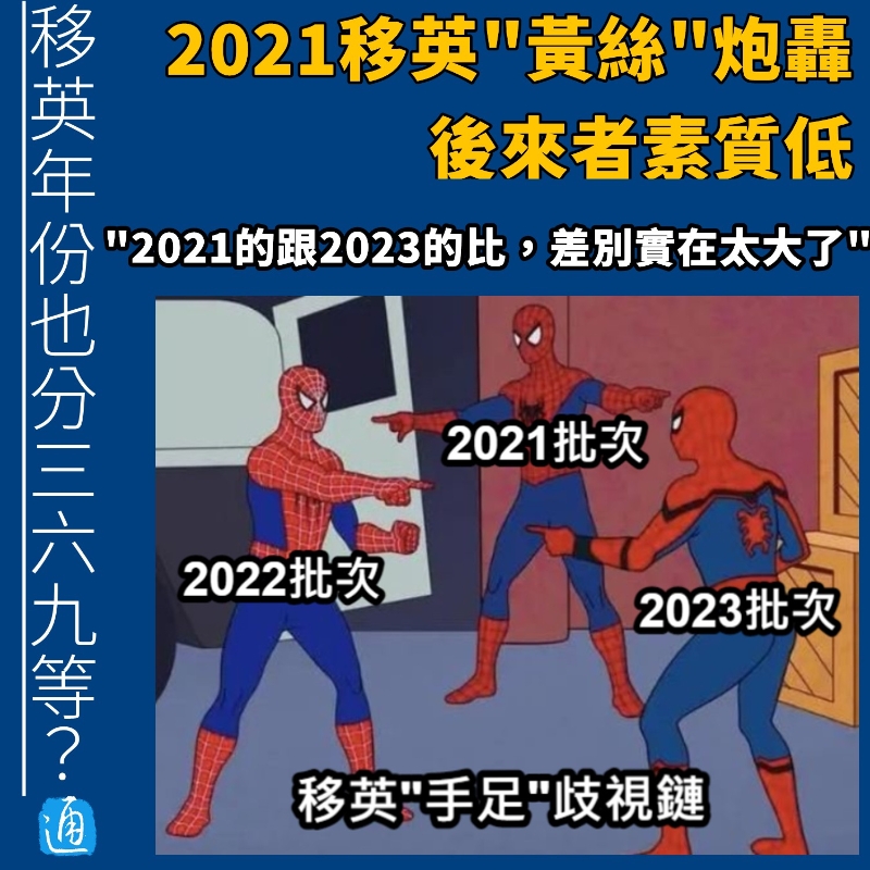香港新聞網製圖 “作為一名移英港人,我最恨的就是移英港人。” 日前,有移英“黃絲”在“連登討論區”以此為題發文稱,相比大部分通過“BNO 5+1”移英的港人,自己是最早走的那批,這批次的港人素質在線,“都很有愛”,然而2021年之後才去的港人,其表現則讓他失望至極。 該“黃絲”說,他自知是吃了“手足”們的“人血饅頭”才有機會通過BNO簽證移英,要懂得感恩,然而有移英港人竟跳出來搶功稱“BNO是他們上街揮英國國旗爭取到的”。 該“黃絲”對此很是憤怒:“真正直接導致有BNO簽證的,是每一個在街頭衝的‘手足’……絕對不是你揮一揮旗就能做到的!” 說到這裡,該“黃絲”再也收不住這2年藏在心裡的“哀怨”,直接炮轟晚來的港人: “為什麼在地區群組裡講政治沒人有反應,但一講到超市有椰子味雪糕、特價泡面就跑去搶?” “為什麼好意思買一車的特價貨?你們是不是不知道英國現在有生存危機,求助食物銀行的人創歷年新高,有英國人窮到買完食物沒錢開暖氣!為什麼不把特價貨留給最有需要的人?” 隨後,該“黃絲”更細數這幾年比較“出圈”的移英港人互坑案例,并感嘆道:“奈何一粒老鼠屎壞了一鍋粥,畢竟2021的移英港人和2023的比,差別實在是太大了。” 不過,“連登仔”們認為該“黃絲”過於“地圖炮”,還批評其言語間儘是藏不住的優越感:“連移民都用年份凸顯優越感。”“早別人2年就嫌棄人,有的人早你20年都沒嫌棄你。”“不能這麼說吧,那本身就是英國國籍的人也可以說不喜歡BNO把他們的檔次搞低啊。”