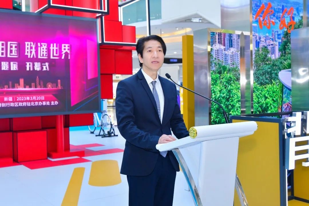香港駐京辦主任鄭偉源(右)與新疆維吾爾自治區黨委常委、統戰部部長伊力扎提·艾合買提江(左)共同主持啟動儀式。 現在香港與世界各地暢通無阻,進入全面復甦的新里程。“你好,香港!”全球宣傳活動已經正式啟動,向全球展現香港的新魅力、新發展、新機遇。香港駐京辦以“香港—背靠祖國 聯通世界”為主題設立展區,展示香港在新的一年,繼續善用自身優勢,發揮所長,進一步融入國家發展大局,開啟建設經濟和改善民生新篇章。