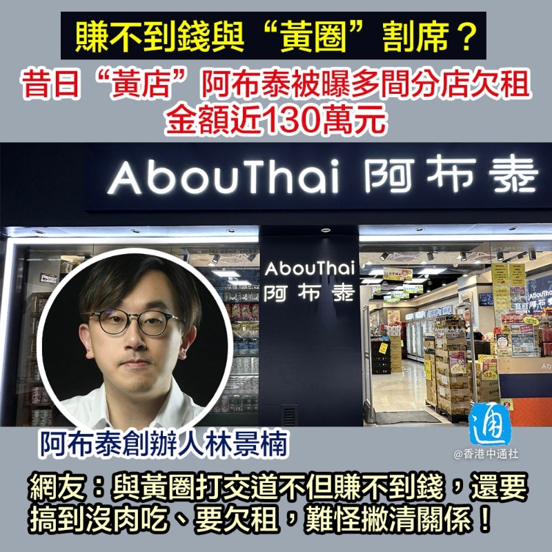 同日,港媒爆料稱,阿布泰自2月起,至少5間分店被入稟追討欠租,涉及金額近130萬元(港幣,下同)。 阿布泰國生活百貨店26間門店中,15間位於新界區,九龍及港島分別有8間及3間,大多數為商場舖。港媒發現,今年2月開始,阿布泰至少有5間分店欠租,涉及金額約128萬元,欠租的分店不乏位於鬧市旺角荷里活廣場地舖分店。 法庭文件顯示,阿布泰鰂魚涌康怡廣場分店,2月1日被業主入稟追討一個月、逾11.1萬元欠租。同一分店於3月20日,再被業主入稟追討逾11.1萬元欠租。 3月內,阿布泰的觀塘APM旗艦店、沙田中心、旺角荷李活商業中心、九龍灣淘大商場都被業主入稟追討欠租。APM分店被追討2個月,共39萬元租金;旺角荷李活商業中心分店被業主兩度入稟,合共追討2個月、逾25.2萬元租金;沙田中心分店被追討3個月租金,合共30萬元;九龍灣淘大商場分店則被追討一個月、逾12.3萬元租金。 “真心次次經過都沒人幫襯。”有曾經路過的網友稱阿布泰門庭冷落。 亦有網友質疑林景楠突如其來的割席,可能是“錢”作怪而已!“與黃圈打交道不但賺不到錢,還要搞到沒肉吃、要欠租,還不趕緊撇清關係!” 林景楠態度發生180度大轉變,有網友諷刺其“兩邊不是人,食相太難看”! 【編輯:張琦】