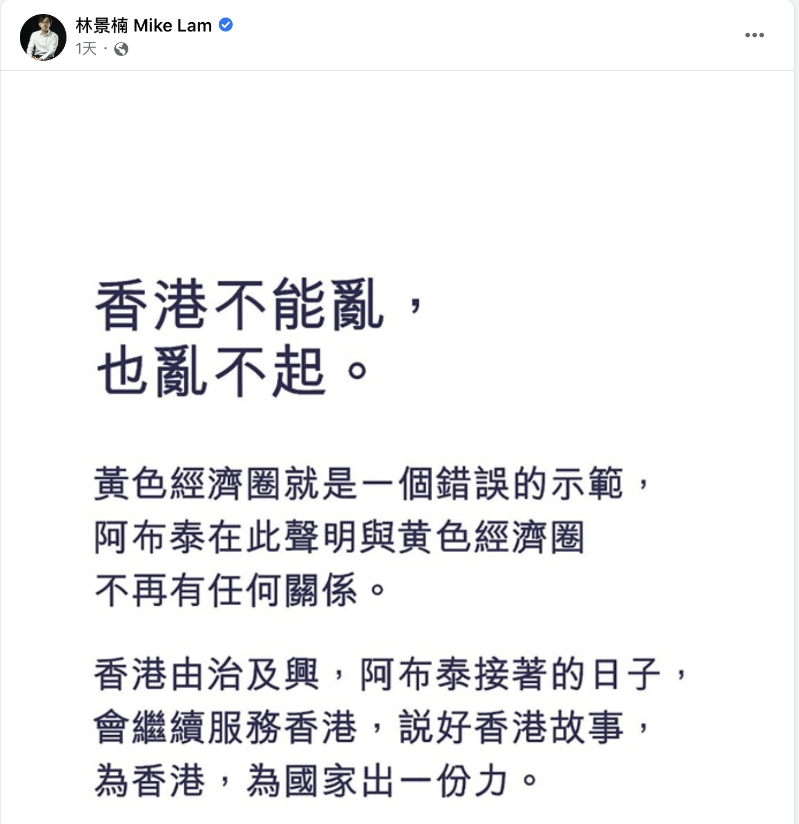 林景楠於2015年創辦阿布泰國生活百貨(簡稱:阿布泰),其後擴展至26間分店。該連鎖百貨店過往常常支持反對派行動,例如“修例風波”期間店鋪派發所謂“良知”貼紙、支援“612黑暴基金”等,分店亦有售賣其他“黃店”商品。 林景楠本人早前因參與反對派非法“初選”,涉違香港國安法被捕。今年2月初案件開審後,林景楠認罪並轉為控方證人。消息傳出後,多家“黃店”與阿布泰“割席”,並將自家商品從阿布泰下架。 昨日(22日),林景楠在社交媒體發文稱:“香港不能亂,也亂不起。黃色經濟圈就是一個錯誤的示範,阿布泰在此聲明與黃色經濟圈不再有任何關係。”他又稱,“香港由治及興,阿布泰接著的日子,會繼續服務香港,說好香港故事,為香港,為國家出一份力。”