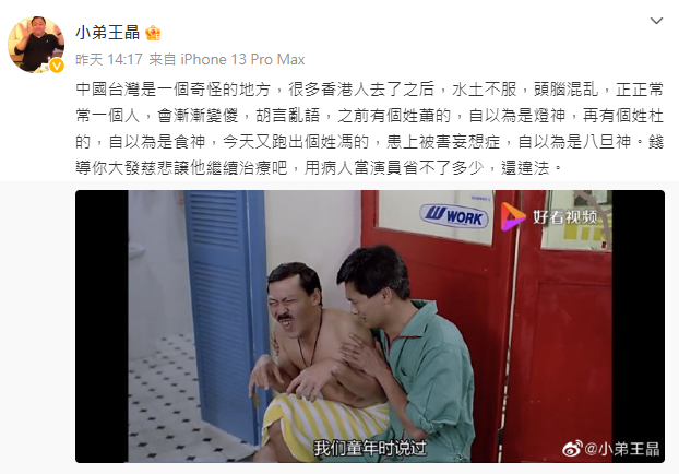 網圖。 王晶的言論一口氣諷刺了“黃絲”Kol蕭若元、“黃絲”港星杜汶澤,以及馮淬帆。不少網友拍手稱快,紛紛表示支持王晶,“支持王導演!這小子當年拿錢時候咋不這麽說”、“支持王晶導演,太不容易了”、“馮先生可能確實不客觀了,大概出於立場吧,眾所周知以前的純港舊片即便是“鬧劇”也比現在的合拍片拍的好多了”、“問題就是2000年左右。就是靠著王晶養活了很多演員”、“但是這個爛片,讓廣大觀眾認識了馮淬帆”。更有網友嘲諷“王晶拿槍頂著頭讓他去拍的嗎?”、“沒熱度了,蹭王導的”。