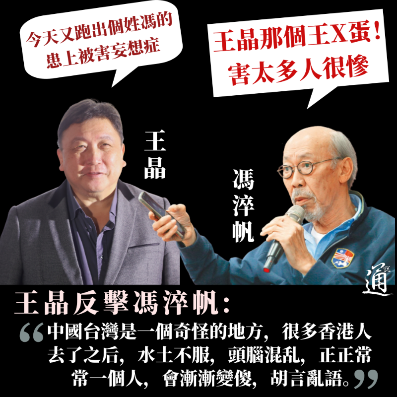 期間馮淬帆更點名讓他一炮而紅的王晶,大罵對方是“王X蛋”,又稱“王晶害了很多人很慘,他拍戲拍得太離譜了!我就不知道為什麼香港觀眾那麼喜歡看!”然而,馮淬帆點名大罵的爛片,包括以王晶自編自導,由周潤發、張曼玉等主演的《精裝追女仔》;以及王晶自編自導,由劉德華、陳玉蓮、邱淑貞等主演的《最佳損友》。 而面對馮淬帆的怒罵,王晶昨日在微博發文回應指,“中國台灣是一個奇怪的地方,很多香港人去了之后,水土不服,頭腦混乱,正正常常一個人,會漸漸變傻,胡言亂語。之前有個姓蕭的,自以為是燈神,再有個姓杜的,自以為是食神,今天又跑出個姓馮的,患上被害妄想症,自以為是八旦神。錢導你大發慈悲譲他繼續治療吧,用病人當演員省不了多少,還違法。”