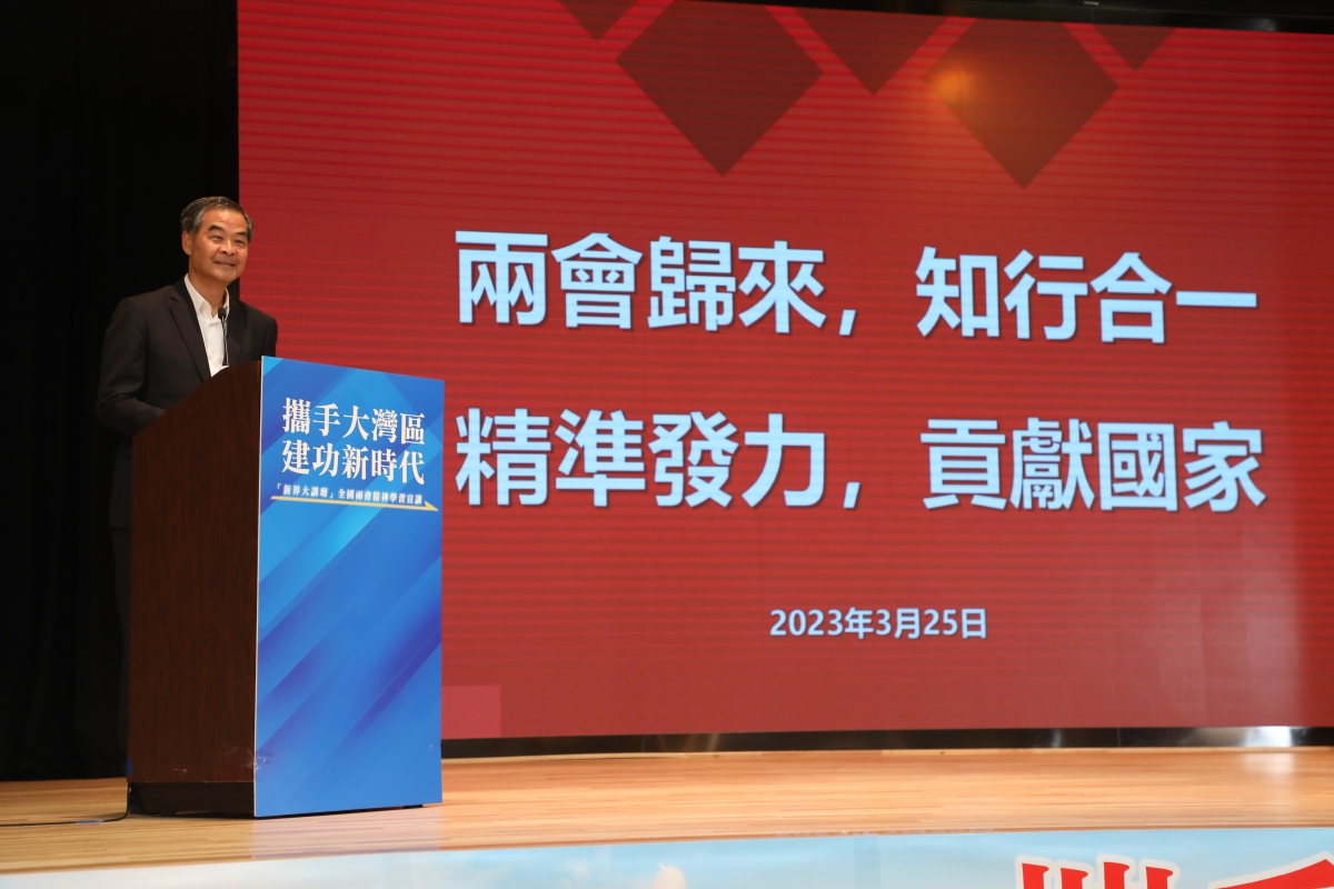 (圖源:新社聯) 李薊貽強調,習近平總書記在“兩會”上指出“推進強國建設,離不開香港長期繁榮穩定”,以及趙樂際、王滬寧分別下團組與港澳委員共商國是,都彰顯了中央對香港的重視關愛。希望參會嘉賓面對“兩會”帶來的發展機遇,要站在新時代的高度,增強大局意識和全局觀念,堅定支持特區政府更加主動地對接國家發展戰略,更積極地融入國家發展大局。 梁振英在主題演講時用十六字總結了參加“兩會”後的感受,即“兩會歸來,知行合一,精準發力,貢獻國家”。梁振英表示,作為國家特別行政區的一位市民,作為在香港生活的中國人,學習“兩會”精神義不容辭。習近平主席在十四屆全國人大一次會議閉幕講話中提到,“在強國建設、民族復興的新征程,我們要堅定不移推動高質量發展。”就大灣區九個城市來看,香港740萬人口的體量並不大,所以要精準發力,實事求是、腳踏實地。