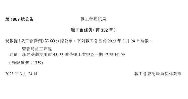 香港新聞網3月31日電 香港政府今日(31日)刊憲宣布,醫管局員工陣線已於上周五(24日)正式解散。