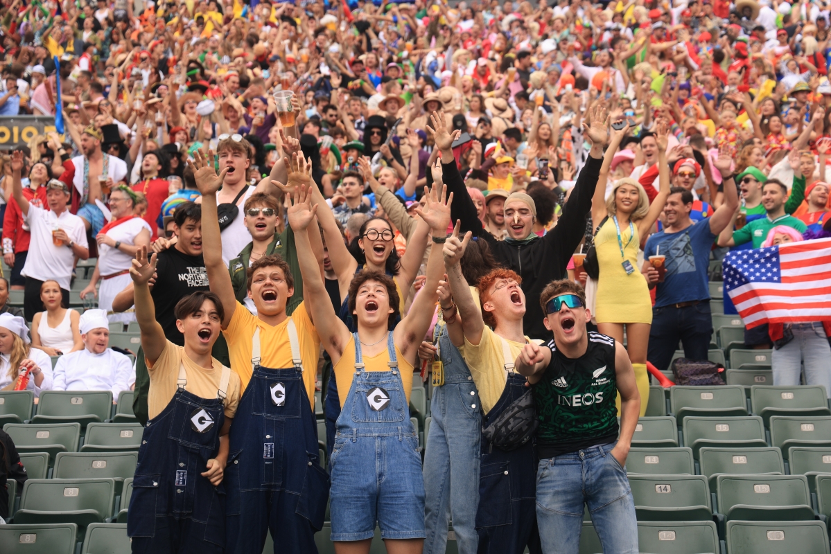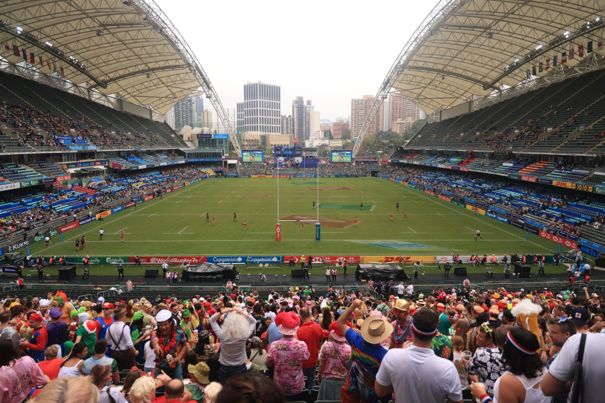 香港新聞網4月1日電(記者 許其皓)2023年香港國際七人欖球賽4月1日在香港大球場舉行第二個比賽日,大批球迷一早已經來到球場看球,更有不少球迷精心打扮,穿著奇裝異服到球場度過愉快的週末,整個球場人山人海,球迷們伴隨著比賽、音樂、美食、美酒狂歡,現場氣氛熱鬧至極。 當日舉行了男子小組賽、女子小組賽和女子排名賽。香港男子代表隊完成,最終以小組賽第四名出線名次賽,將於4月2日與其他七隊爭奪第九名。香港女子代表隊在當日結束本次賽事的所有比賽,最終僅取得第十二名的成績。
