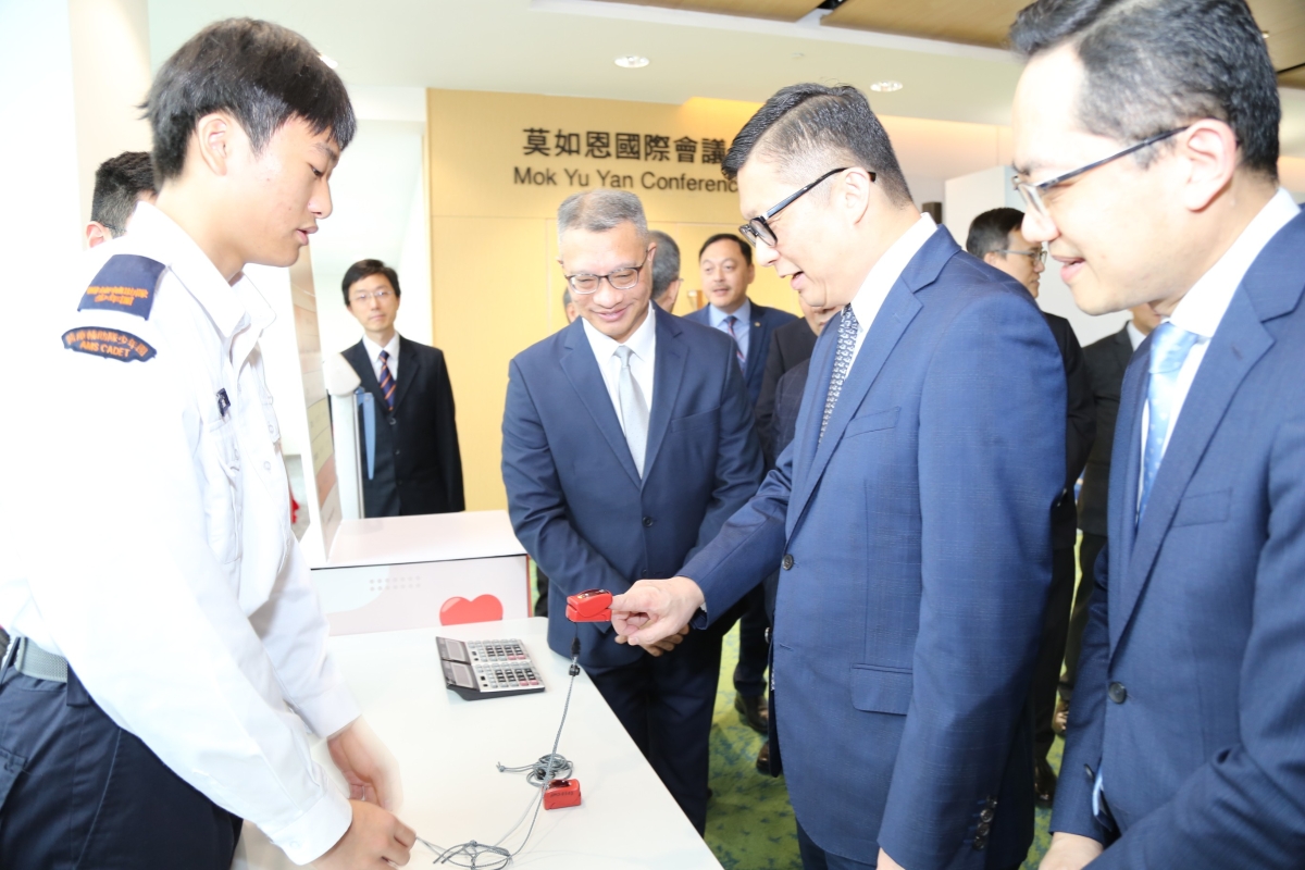 圖示保安局局長鄧炳強(右二)在醫療輔助隊總監林文健(右一)和總參事黃英強(右三)的陪同下參觀現場醫療輔助隊的攤位。
