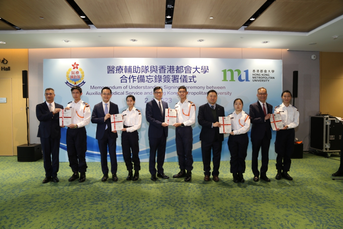 合作備忘錄由醫療輔助隊總參事黃英強(左二)及都大校長林群聲(右二)共同簽署,並由保安局局長鄧炳強(左一)及都大校董會主席黃天祥(右一)共同見證。 合作備忘錄由醫療輔助隊總參事黃英強及都大校長林群聲教授共同簽署,並由特區政府保安局局長鄧炳強及都大校董會主席黃天祥博士共同見證。 鄧炳強致辭時表示,特區政府非常重視青年發展,這次簽署合作備忘錄,標誌着醫療輔助隊與都大將會進一步促進雙方於不同層面上的合作,尤其以護理及醫療專職培訓、義工服務以及青少年服務方面,將會帶來協同效應,為香港培育更多人才。 黃天祥表示,都大作為香港培育護理專才的主要學府,他深信與醫療輔助隊攜手合作,必定能為香港帶來更大的裨益。 醫療輔助隊與都大將透過各項教育活動,包括醫療及衞生培訓、服務學習計劃、義工服務、職涯規劃,推動青年人多元發展。