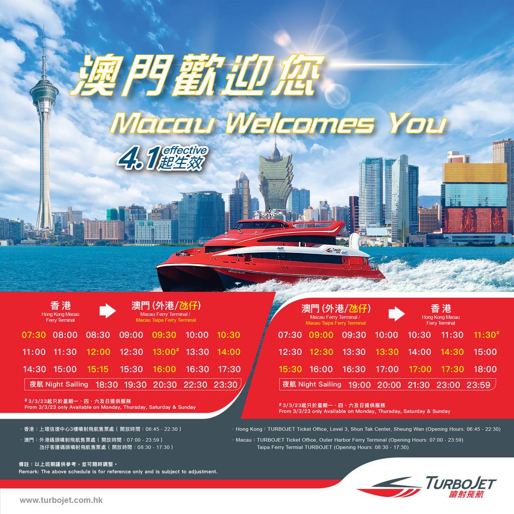 香港新聞網4月3日電  噴射飛航日前宣布,由4月1日開始,日、夜航船次共增加到52班,乘客無論在復活節長假期還是周末假期,都更容易安排船程往返澳門,讓享受假期的時間可以規劃得更好。