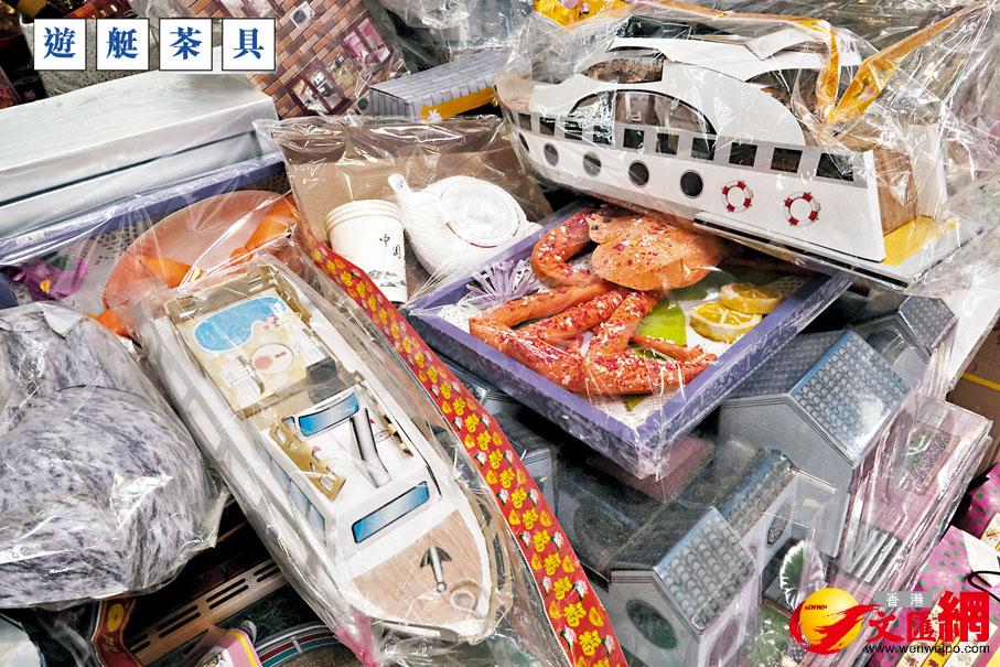 遊艇茶具祭品。(香港文匯報記者 涂穴 攝) “新奢侈品”佔半 “手機”要追新款 “俊城行”店主杜先生指,已在西營盤經營店舖40多年,感覺今年特別多人過來買祭品。至於今年市道,杜先生表示,因為進貨價變化不大,故售價亦與往年相若,“復常通關之後,跨境運輸業恢復了,內地行業也有競爭,給我們的來貨價也沒有偏貴。” 他並分析指,顧客年齡段不同購買選擇亦有差異,“年紀大一些的顧客就買比較傳統的香燭紙錢,通常花費200多元,中年人會買多一些,花費三四百元,年輕人一般比較鬆手,對新奇產品有興趣,消費會更多。龍蝦、酒水、甜品等造型的紙紮產品很受歡迎,新式與傳統紙紮祭品的銷情比例大致是一半一半。” 另一紙紮店“寶泰行”負責人關先生則表示,紙紮品屬於應季的薄利產品,提價空間非常有限,銷售額多寡主要視乎顧客人數,“香和紙錢這些賣開幾十元,很多年來都是一樣,這幾年有些新式產品,像手機之類的(紙紮商品),本身樣式沒有很大變化,換個標籤就是最新款了。”