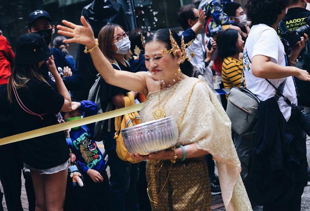 香港新聞網4月9日電(記者 曹文毓)2023年香港潑水節由4月6日起至10日在香港荔枝角D2 Place舉行。4月9日,潑水節嘉年華、激FUN水戰派對等項目舉行,此外,系列活動包括“翟道翟”式巿集、泰國傳統舞蹈表演、祈福儀式、傳統泰國服飾試穿以及多個傳統手工藝工作坊等為前來的觀眾帶來泰國節慶熾熱氣氛。