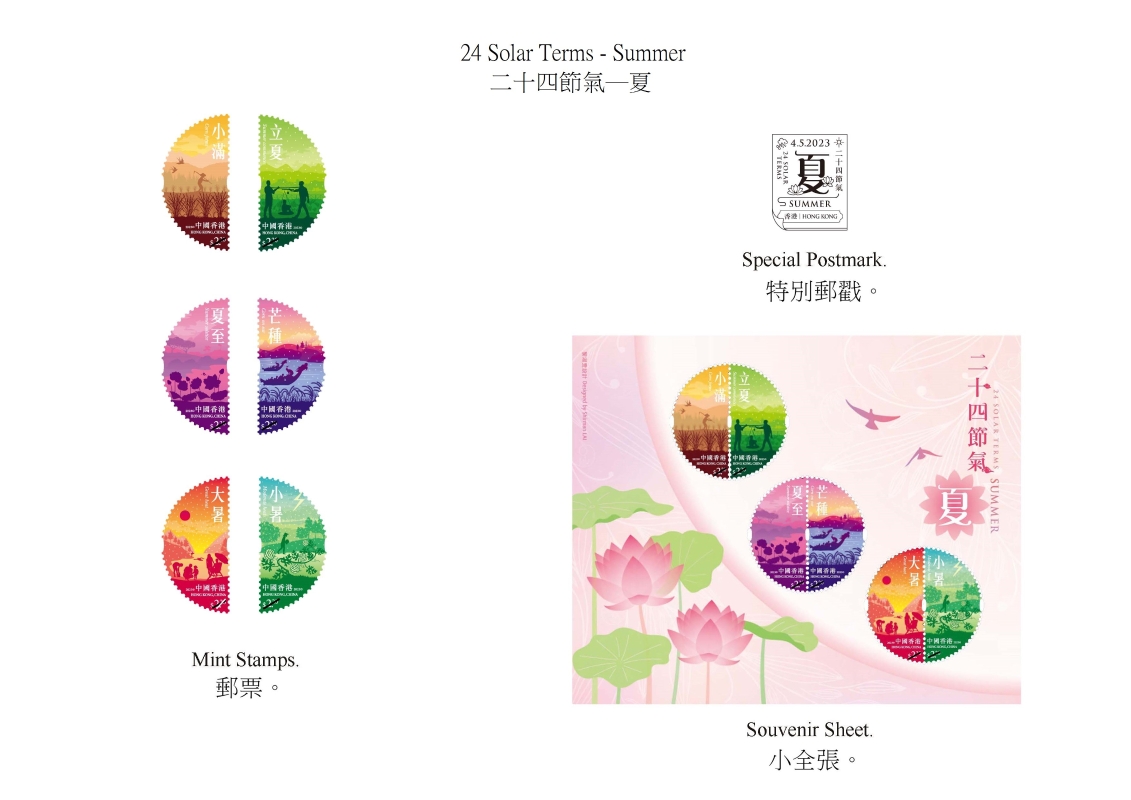 圖示郵票、小全張和特別郵戳 “二十四節氣”是指中國古人透過觀測太陽周期運動、季節和物候規律,配合社會發展演變而成的時間知識體系,實踐於傳統農業生產和日常生活。中國內地申報的“二十四節氣──中國人通過觀察太陽周年運動而形成的時間知識體系及其實踐”提案,於2016年列入聯合國教科文組織《人類非物質文化遺產代表作名錄》。 繼2020年發行以“二十四節氣──春”為題的特別郵票,香港郵政續以“二十四節氣──夏”為題發行一套六枚郵票、一張小全張及相關集郵品,以繽紛的色彩介紹夏季六個節氣,分別為立夏、小滿、芒種、夏至、小暑及大暑,延續“二十四節氣”郵票系列。 全線郵政局和網上購物坊“郵購網”19日起發售“二十四節氣──夏”正式首日封。這套特別郵票及相關郵品五月四日起在各郵政局及“郵購網”發售,而貼有特別郵票的已蓋銷首日封只限在集郵局發售。(完) 【編輯:崔靜雯】