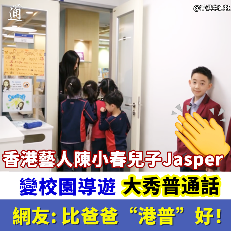 (視頻截圖) “第一站是我們低年級的圖書館。”Jasper用普通話說道,之後又帶領觀眾參觀學校的音樂室、畫室及遊樂場等。期間,他抵達音樂教室,聽到熟悉的旋律時,還忍不住跟著合唱。 由於父母均是藝人的關係,Jasper也算小童星了。2017年,他跟著父親陳小春一起參加內地綜藝節目《爸爸去哪兒第五季》的錄製,當時紳士可愛的表現收穫不少網友喜愛。 此次,Jasper再在熒光幕前大秀普通話,亦獲不少網友關注、點讚。 在內地社交平台上,網友紛紛稱讚Jasper的普通話進步不少,比爸爸的“港普”好,笑言“來上海讀書是非常對的”。