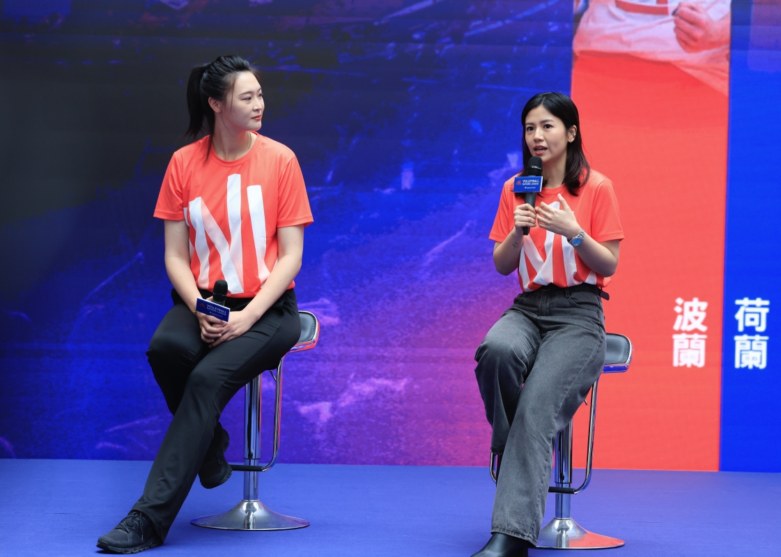 中國女排前隊長惠若琪(左)和香港藝人楊偲泳(右)出席,分享各自的體育賽事經驗 【編輯:曹文毓】