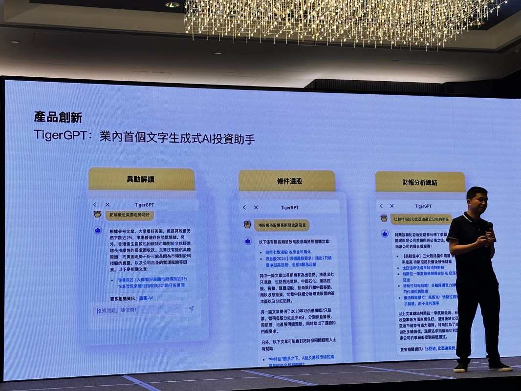 香港中通社圖片 老虎錢罌是專為Tiger Trade用戶而設,方便用戶把閒置現金投資於收益穩定、低風險、流動性強的貨幣市場基金。同時,投資者可以透過自動申贖功能,即時用老虎錢罌內的資金買賣股票、期貨、期權,甚或認購新股,盡享資本增值機遇,保障資金靈活流動。 作為新型券商,老虎證券還推出了Tiger GPT,投資者可以在app上詢問財報分析、股價異動解讀,而這些資訊都是老虎證券購買的專業數據,在財經垂直領域上數據都是最新且最專業的。巫天華希望老虎證券以科技為金融平權,讓用戶在投資前能獲取更多信息,加強認知,在投資中變現為收益。(完) 【編輯:李明珠】