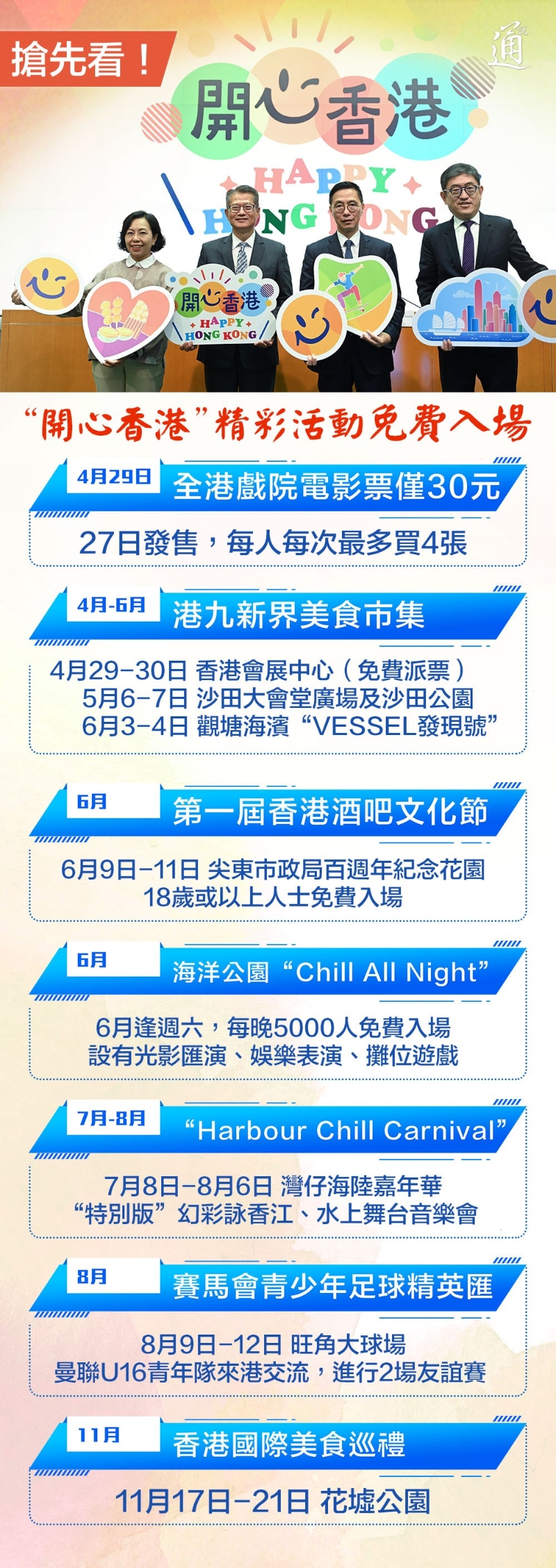 香港新聞網4月25日電 香港特區政府24日公布“開心香港”(Happy Hong Kong)活動詳情,各類免費入場的精彩活動不容錯過! 4至6月港九新界將分別舉辦三場大型美食市集,市民屆時可免費入場,首場於本周六(29日)在灣仔會展舉行。此外,本周六亦是“全港戲院日”,觀眾當日在全港戲院看電影,票價劃一僅需30港元。 第一屆香港酒吧文化節將於6月閃亮登場,多場嘉年華亦輪番上演,8月香港則會迎來曼聯青年隊與本地足球精英交流。“開心香港”還有哪些精彩活動?一圖看清!