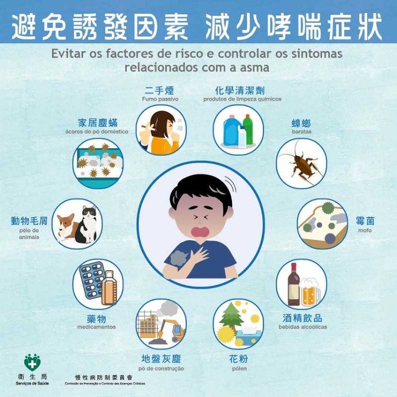 圖片來源:澳門新聞局 常見病因包括家庭成員尤其直系親屬有哮喘問題,本人患哮喘可能性則更大;有其他過敏症例如濕疹和鼻炎的人;早產、低出生體重嬰兒及過早接觸煙草煙霧;城市化造成的空氣污染也是導致患病率上升的一個因素。 哮喘常見的誘發因素包括有吸煙、塵蟎、空氣污染、蟑螂及其排泄物、寵物毛屑、冥鏹燃燒煙霧、過敏的食物(例如蝦、蟹、蜆)。 因此,要有效控制哮喘發作必須避開誘因,同時也要學會正確使用相關的治療藥物(例如支氣管擴張劑及類固醇藥物),以改善症狀、降低嚴重哮喘發作和死亡的風險。(完) 【編輯:崔靜雯】