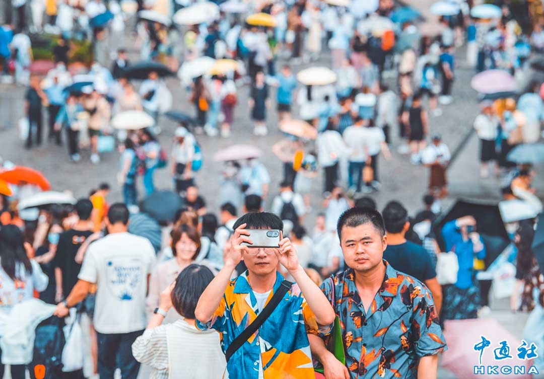 4月30日正值五一旅遊黃金周,大批旅客訪港遊玩,除了太平山頂、尖沙咀星光大道、中環蘭桂坊這些耳熟能詳的景點外,舊油麻地警署也成為一個遊客打卡的熱點。座落在油麻地廣東道鬧市的舊油麻地警署,是電影或電視劇中時常出現的背景,它是一座新古典主義愛德華式建築物,現被列為二級歷史建築。圖為當日,大批旅客在舊油麻地警署前拍照。(香港中通社記者 謝光磊攝)
