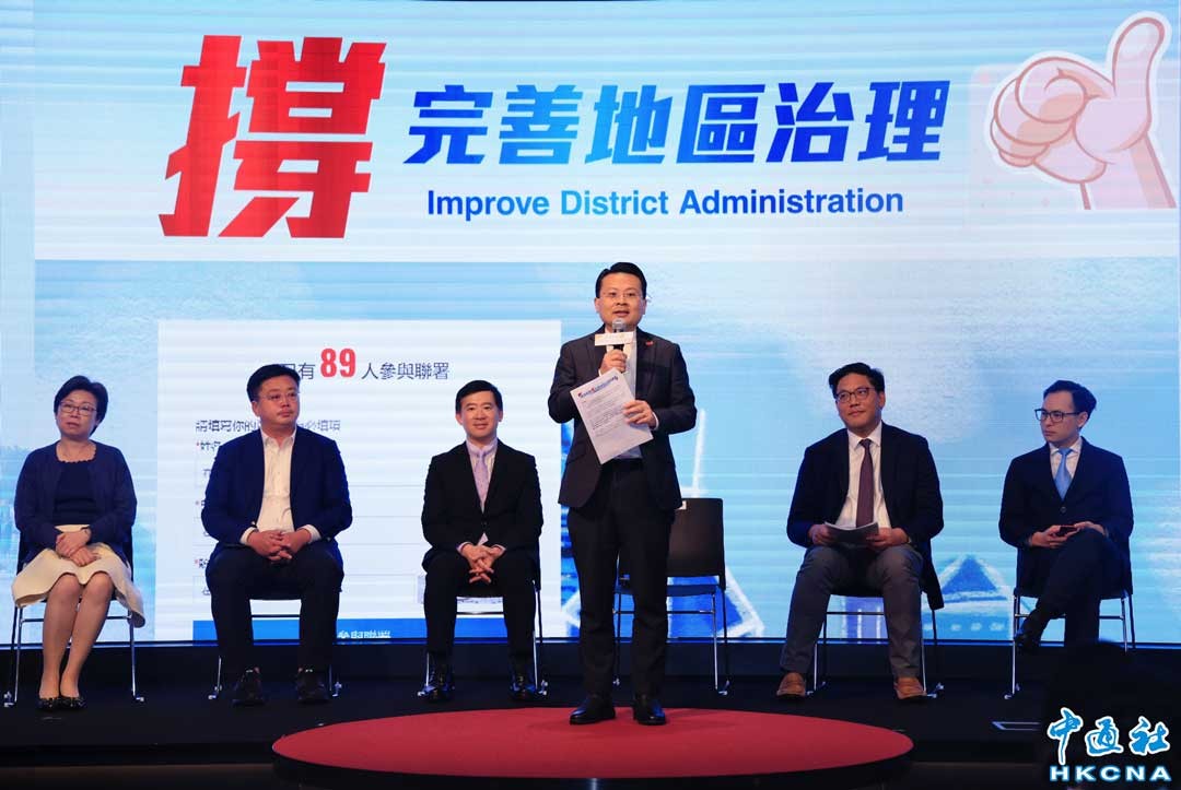 5月10日,“香港各界撐完善地區治理大聯盟”開始發起網上簽名,並於灣仔舉行啟動禮,讓市民在線上、線下都可參與,表達對完善地區治理的支持。圖為圖為大聯盟執行總指揮兼發言人陳勇在啟動禮上發言。(香港中通社記者 曹文毓攝)