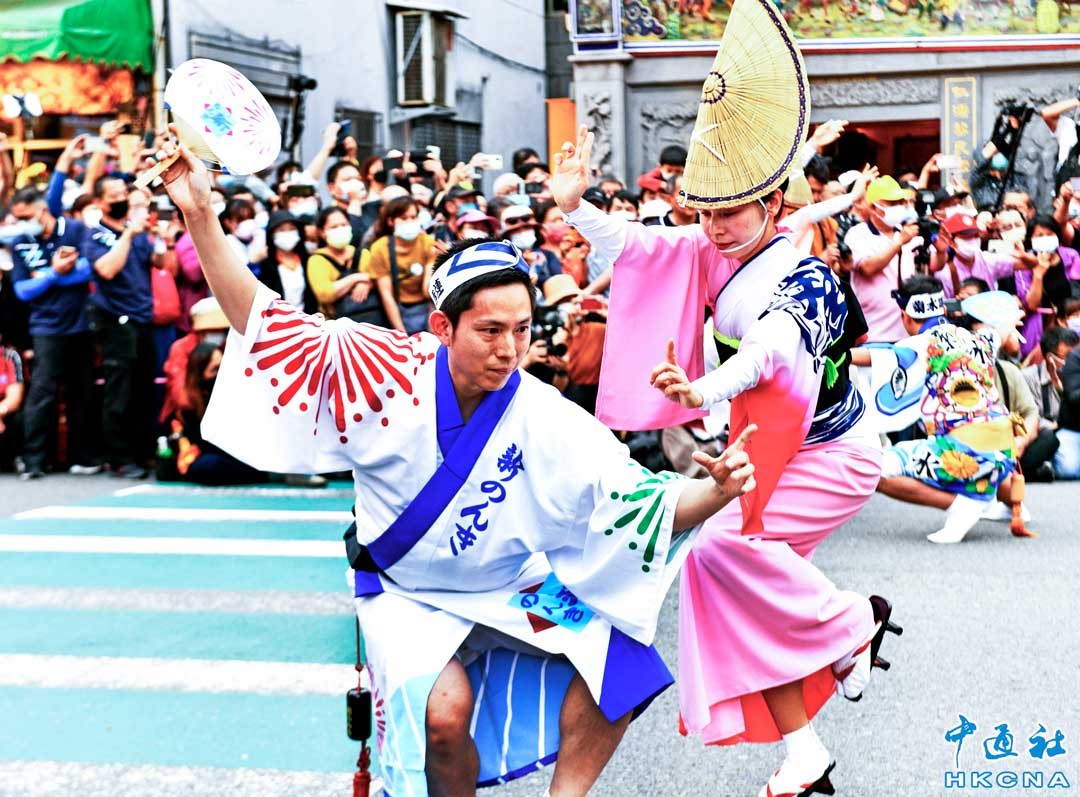 台灣桃園市平鎮區褒忠祠義民廟5月11日舉辦“232周年義民文化季”活動,邀請日本東京高圓寺阿波舞團在平鎮區義民廟踩街表演,展演隊伍將沿路以獨特的節奏和群舞方式,讓民眾觀賞不一樣的廟會活動。 香港中通社圖片