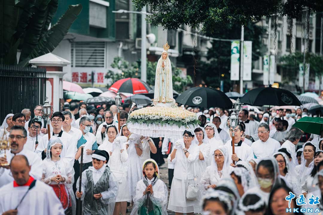 5月13日,澳門舉行 “花地瑪聖母聖像出遊”,隊伍從玫瑰聖母堂步行出發,恭移花地瑪聖母聖像至西望洋聖堂,沿途誦念玫瑰經及高唱聖母歌,並在西望洋聖堂舉行儀式,場面盛大莊嚴。“花地瑪聖母聖像出遊”於1929年首次在澳門進行,後來逐漸成為本地富有特色的宗教慶典,於2019年被列入澳門《非物質文化遺產名錄》。香港中通社圖片