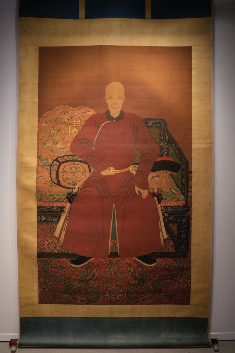 清初《親王常服像》。畫中人約古稀年紀,神態雍容自若,儒雅慈祥而不失威嚴。他端坐於描金大漆寳座,身著絳色“卐”字暗花緞冬季常服,領緣、袖端鑲以貂毛。腰間配金黃色常服帶,墜以荷包、鞘刀、象牙牙籤筒等飾件。