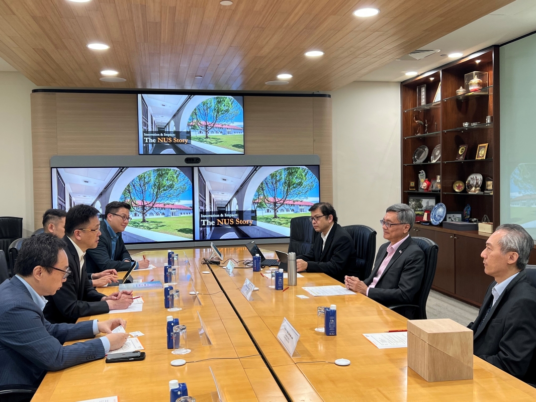 圖片來源:香港新聞處。孫東(左二)在新加坡參觀新加坡國立大學,聽取校長陳永財(右二)介紹該公立研究型大學的學術成果和發展。