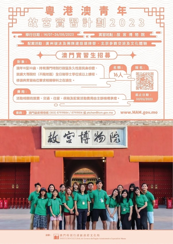 圖片來源:澳門新聞局 實習計劃可提供申請的崗位包括故宮博物院宣傳教育部、文創事業部、宮廷歷史部、器物部、國際交流處、古建部、世界遺產監測部、文物保護標準化研究所、展覽部及考古部等10個部門,涉及14種博物館工作的範疇。 “粵港澳青年故宮實習計劃”曾於2018年及2019年舉辦,原名為“故宮博物院青年實習計劃”,旨在加強青年對國家和中華文化的認同和認識,讓青年學以致用,親身體驗博物館的工作實況,促進粵港澳青年進行文化交流,並培養專業技能,積累工作經驗,增強自身競爭力。 今年“粵港澳青年故宮實習計劃2023”將招收澳門特區、香港特區、廣東省三地共48名在學青年進行為期44天活動,包括廣州團建訓練營、故宮博物院實習及北京文化觀光體驗活動。 北京故宮博物院擁有世界上規模最大、保存最完整的木結構宮殿建築群,收藏古書畫、古器物、宮廷文物及書籍檔案等珍貴藏品超過186萬件,為全球參觀人數最多的博物館。(完) 【編輯:崔靜雯】