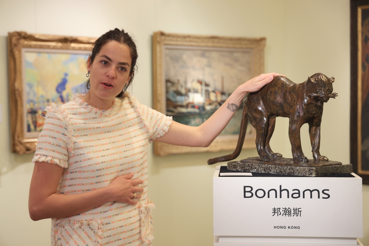 阿倫·狄龍的女兒阿努什卡(左)和巴黎邦瀚斯行政總裁Arnaud Cornette de Saint Cyr 阿倫·狄龍的女兒阿努什卡介紹藏品《豹怒吼》