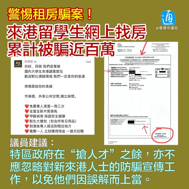 警惕租房騙案!來港留學生網上找房 被騙近百萬香港新聞網5月25日電 日前,有準備來港的內地留學生在網上尋房源,簽了所謂合同並支付按金後發現被騙!據悉“苦主”有十幾人,累計被騙金額已高達近百萬港元! 據港媒報道,8月將來港讀碩士的小芬(化名)在網上尋找房源,最後與一家叫“修德居”的公司簽訂了訂房確認書,並將對方要求的“三按一上”匯入對方賬戶,共計6.6萬港元(約57000人民幣)。由於對方提供大量文件證明“可靠性”,令小芬不疑有詐。 本以為租房一事大功告成,但小芬的在港朋友看過文件後,直指印花證明書和租約都有問題。朋友指出,印花證明書存在幾處英文拼寫錯誤,包括將日期Date寫成Dete、付款Payment寫成Paymeut;而下方的“你可於www.gov.hk/estamping核對此證明書的真確性”等字樣,亦與稅務局樣本字體不同,部分文字非常模糊且帶有底色,似乎是修圖偽造而成。
