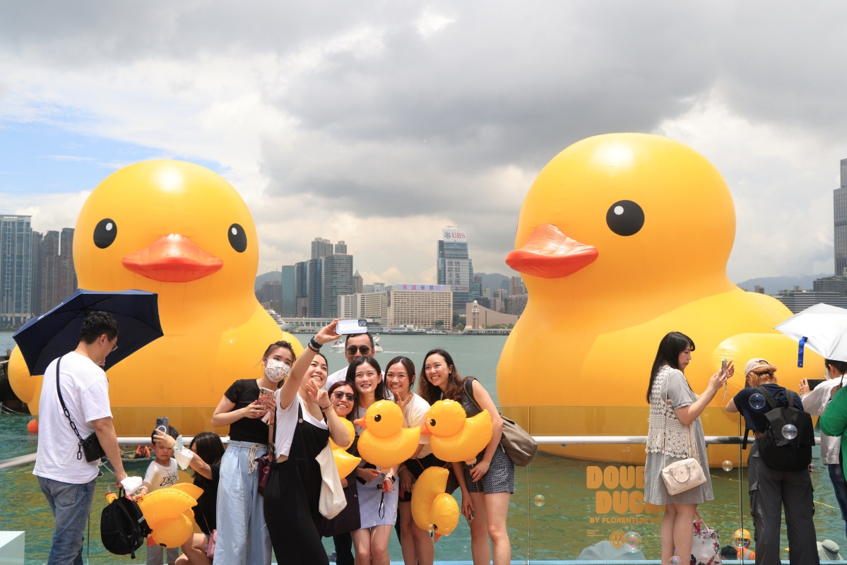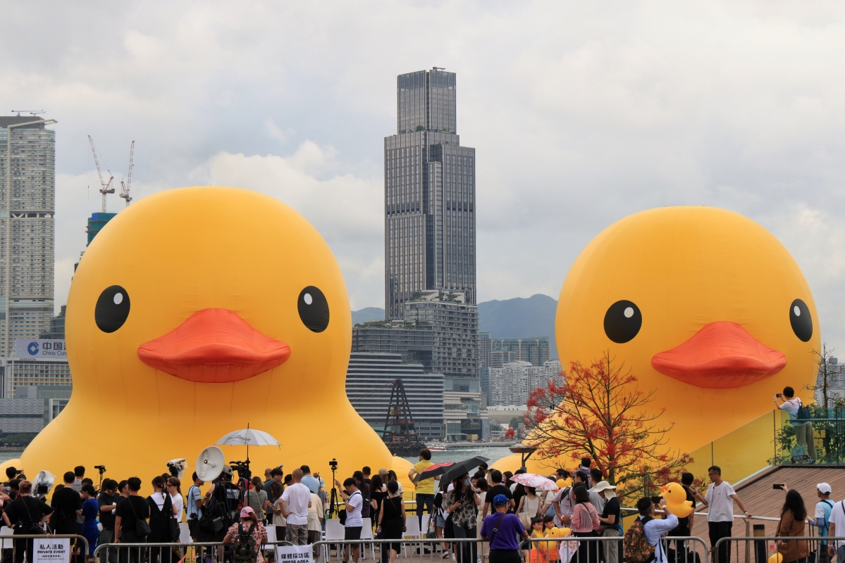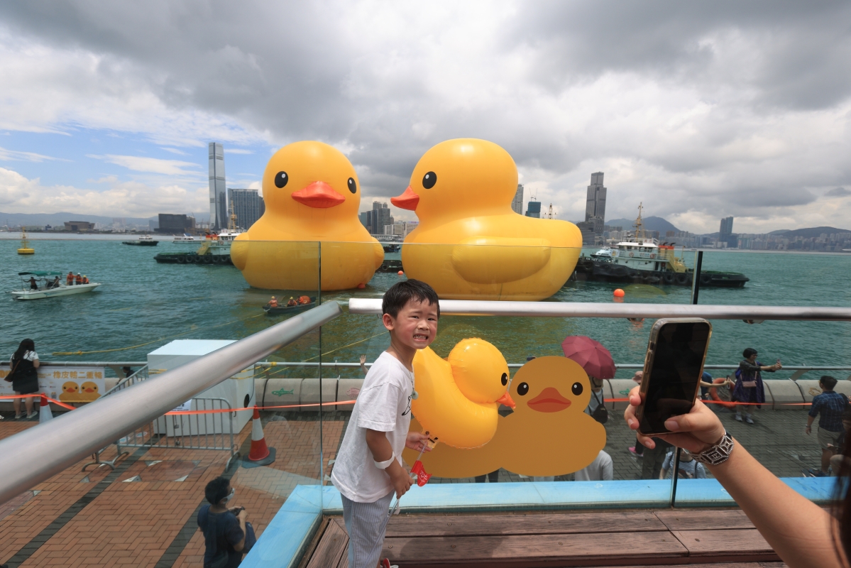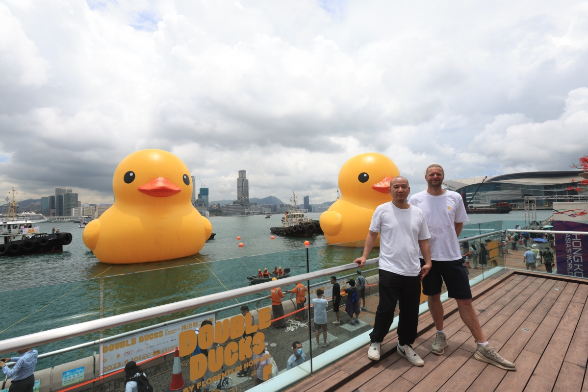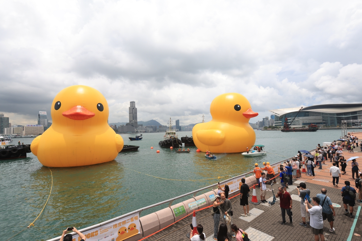香港新聞網6月9日電(記者 許其皓)6月9日,大型公共藝術海上展覽《橡皮鴨二重暢》預覽日暨啟航禮在香港中環海濱舉行。一對高18米的橡皮鴨停駐在維港海面,毗鄰添馬公園及中西區海濱長廊,與絢麗多彩的維港景色相映成趣,吸引了大批市民提前來打卡。 荷蘭藝術家霍夫曼(Florentijn Hofman)創作的巨型橡皮鴨,自2007年起遨“游”世界各地,2013 年 的《橡皮鴨游世界·香港站》由創意品牌 AllRightsReserved(ARR)策展,吸引大批市民旅客蜂擁親臨維港一睹真身。今年適逢橡皮鴨訪港10周年,ARR 特別主辦大型海上公共藝術展覽《橡皮鴨二重暢》, 與霍夫曼再度攜手帶橡皮鴨重臨維港,更首度偕同伴雙雙暢遊維多利亞港,象徵好事成雙,雙喜重臨, 為香港增添雙倍快樂。展覽將於6月10日起開放予公眾,展期預計為期兩星期。