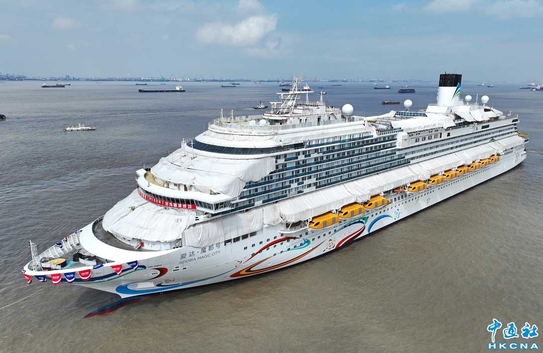 6月6日,中國首艘國產大型郵輪“愛達·魔都號”在中國船舶集團有限公司旗下上海外高橋造船有限公司2號船塢順利出塢,全面開啟碼頭繫泊試驗、出海試航和命名交付的決戰週期。圖為航拍首艘國產大型郵輪“愛達·魔都號”出塢。香港中通社圖片