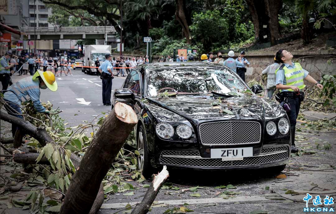 6月8日下午約2時30分,香港尖沙咀海防道近漢口道有一棵大樹倒下,塌落海防道攔住兩條行車線,並壓中一輛黑色賓利私家車。私家車車頂及車頭冚凹陷,司機清醒但被困。大批消防員趕到現場,用工具鋸樹,耗時約20分鐘將司機救出送院。現場所見,大樹種在九龍公園外圍的石壆斜坡上,離地近兩米。大樹的樹幹直徑約半米,枝葉茂密。 (香港中通社記者 謝光磊攝)