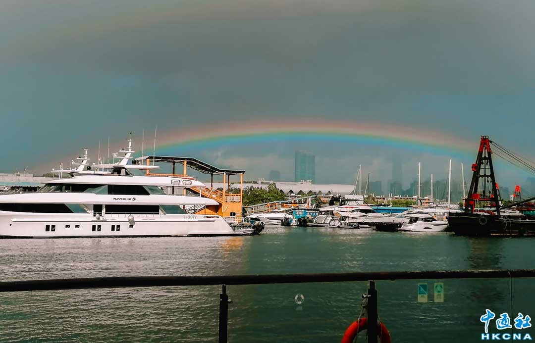 6月8日上午,香港維港上空雨後出現彩虹橋。吸引兩岸市民拍攝。圖為觀塘海濱避風塘上空彩虹。(香港中通社記者 洪少葵攝)