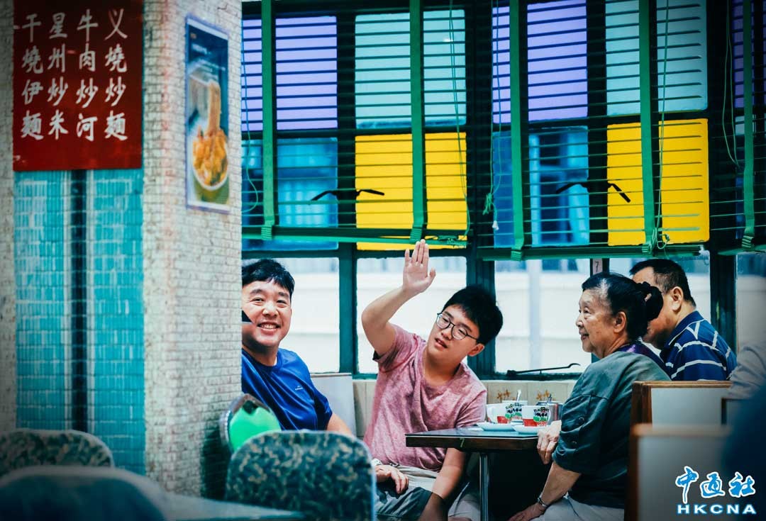 美都餐室位於香港油麻地,曾是多部電影和和電視劇的取景地,其內部的環境佈置亦是受歡迎的主因之一;紙皮石牆、二樓的綠色鐵窗、舊式天花和地磚等,皆充斥著濃厚的50年代風味。圖爲美都餐室食客。 (香港中通社記者 曹文毓攝)