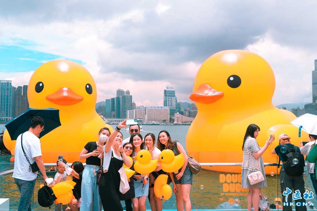 6月9日,大型公共藝術海上展覽《橡皮鴨二重暢》預覽日暨啟航禮在香港中環海濱舉行。一對高18米的橡皮鴨停駐在維港海面,毗鄰添馬公園及中西區海濱長廊,與絢麗多彩的維港景色相映成趣,吸引了大批市民提前來打卡。這是荷蘭藝術家霍夫曼(Florentijn Hofman)創作的巨型橡皮鴨時隔10年第二次訪港,展覽將於6月10日起開放予公眾,展期預計為期兩星期。 (香港中通社記者 許其皓攝)