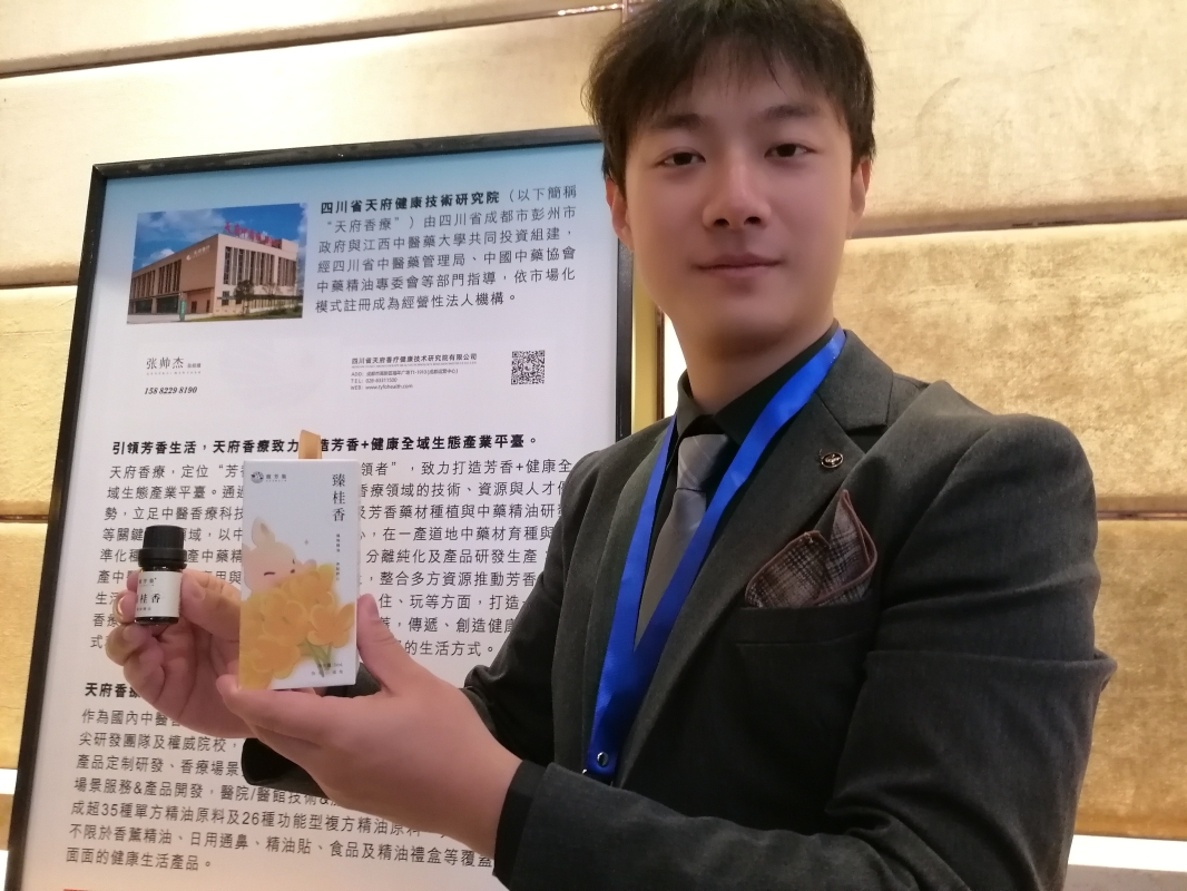 “天府香療健康科技研究院”項目經理黃天齊介紹各式中草藥植物提煉的香薰,這是“臻桂香”植物精油。