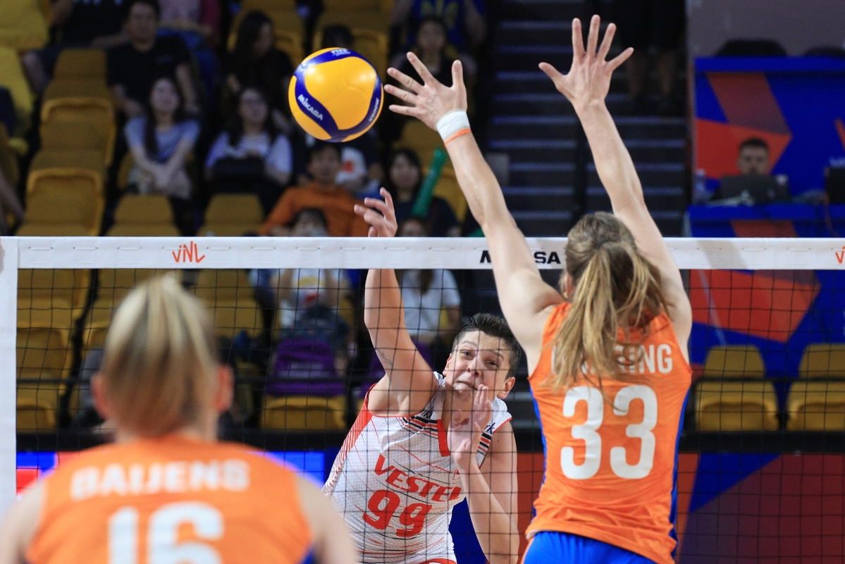 14日第二個比賽日,土耳其女排(白)3:0戰勝荷蘭女排(橙)。