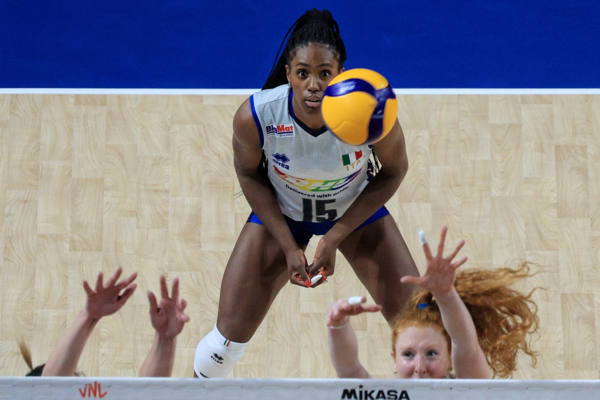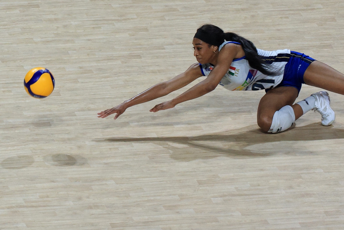 14日第二個比賽日,意大利女排(白)3:0戰勝保加利亞共和國女排(紅)。