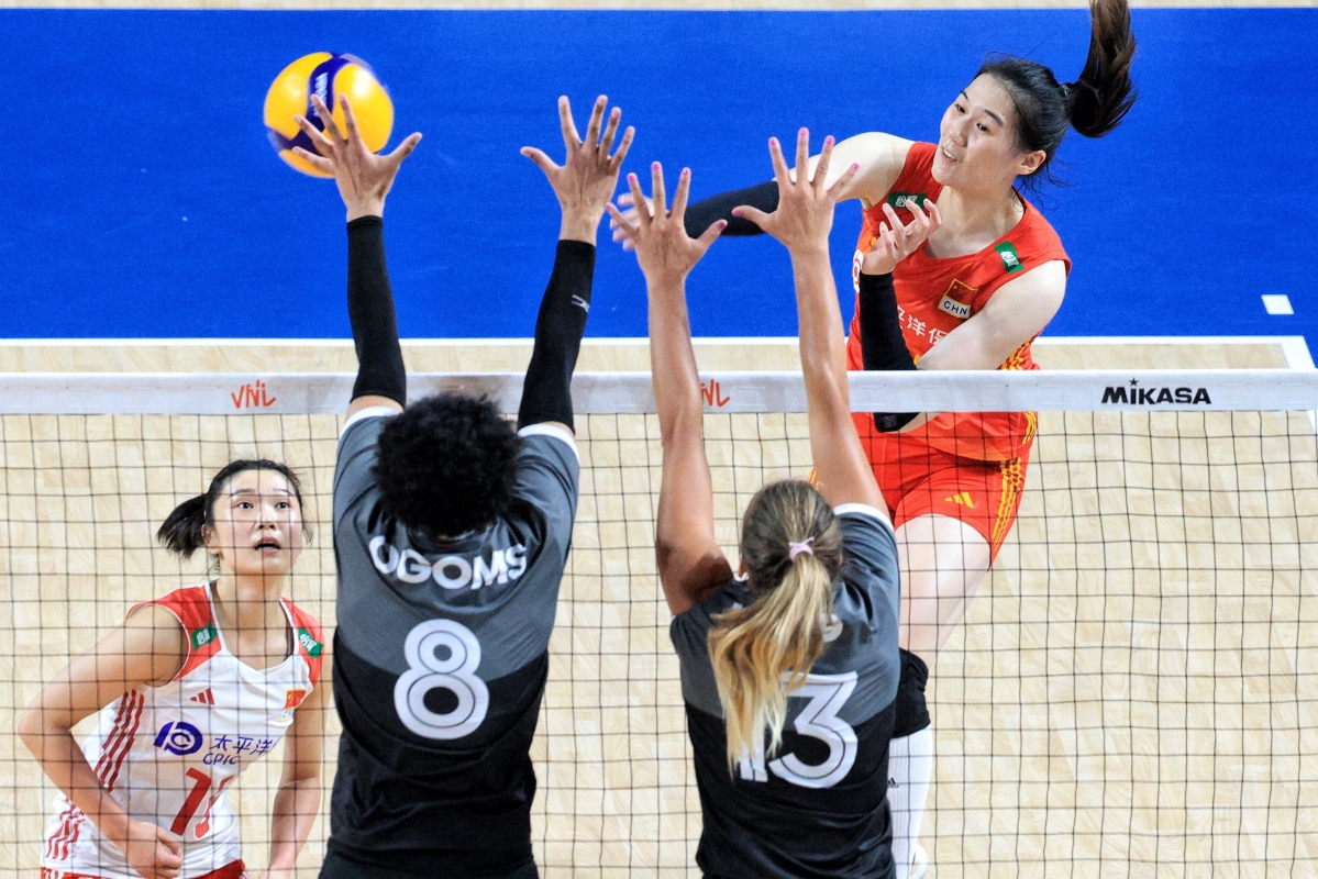 6月13日開賽,中國女排首場比賽以3:0戰勝加拿大女排。圖為中國女排隊員王雲蕗(紅色10號)在比賽中扣球。