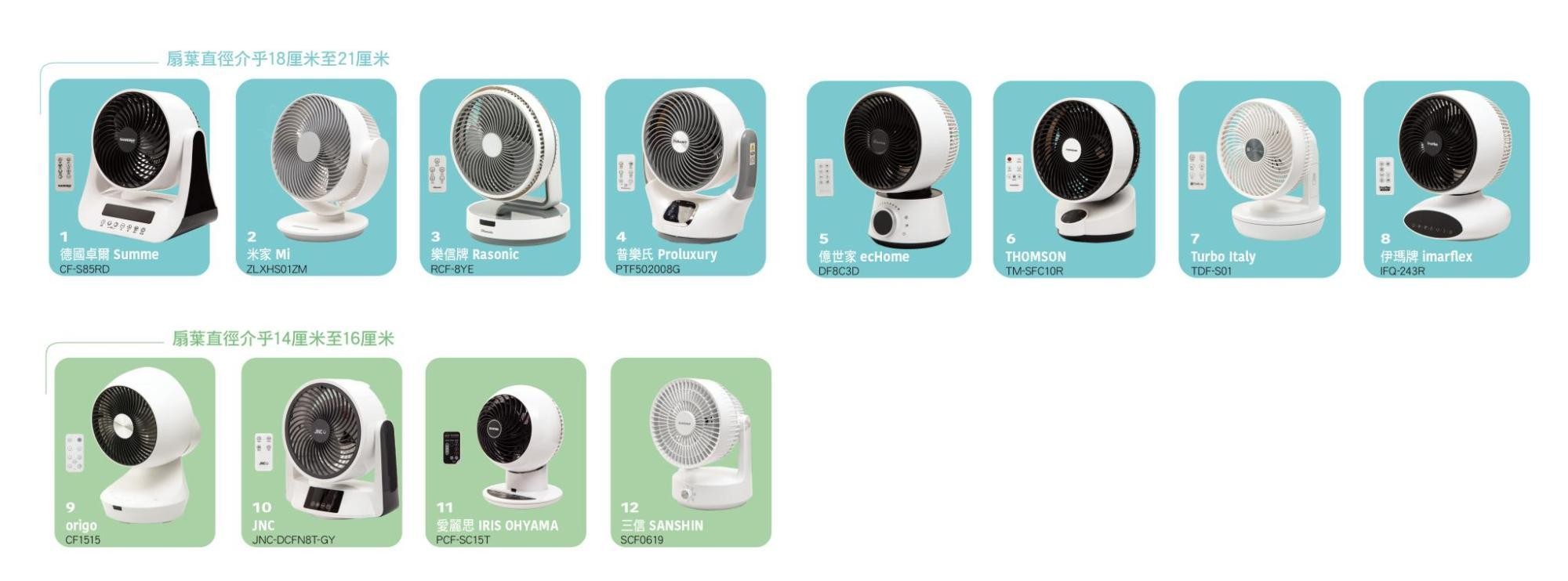 香港消費者委員會測試了12款循環扇的安全及效能表現。圖源:消委會 香港機電署詳細分析測試報告後,已聯絡供應商跟進有關產品的安全事宜。相關供應商亦承諾會作出相應改善,務求令產品更安全可靠及符合國際安全標準的要求。就個別品牌樣本有溫升超出標準上限、絕緣距離、機械安全性、內部電線耐用程度或部件阻燃能力不足等問題,有關供應商表示所述不足之處有可能與個別產品的質量有關,並承諾會對相關產品的生產流程、質量控制等方面作出跟進及制定相應的改善方案。 雖然有樣本未能完全符合安全標準的要求,但在正常操作下不會構成危險。另外,就樣本“伊瑪牌imarflex”及“三信SANSHIN”有部件阻燃能力不足等問題,供應商願意就相關批次產品安排自願回收及更換零件以釋除市民疑慮及確保產品安全。