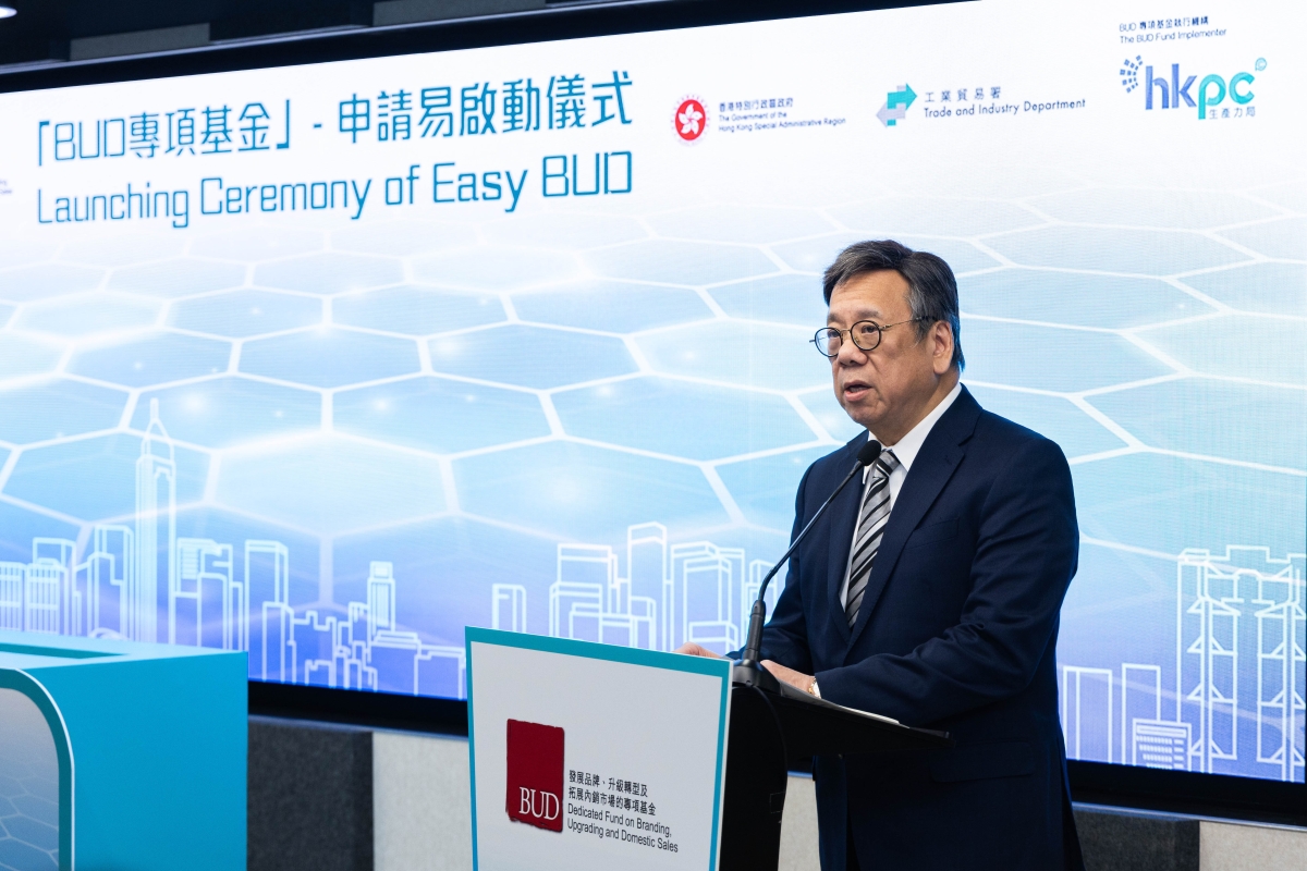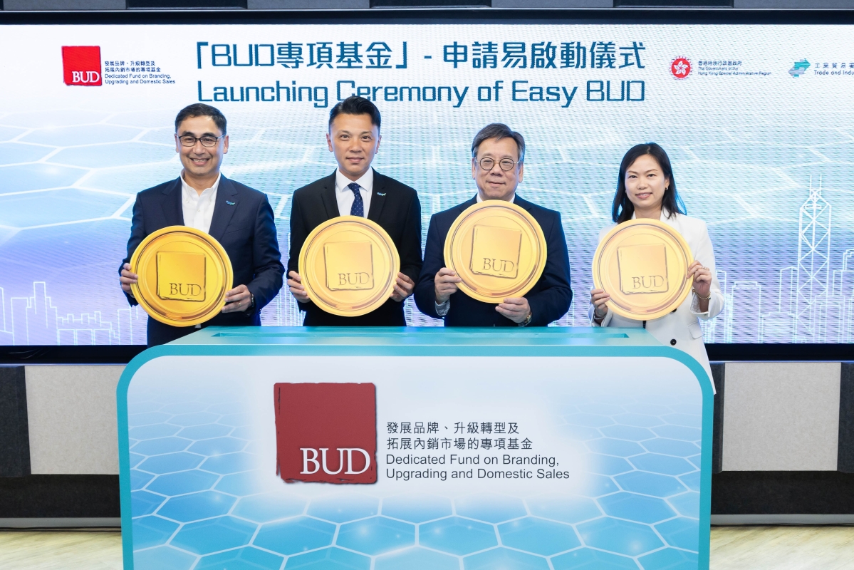 圖片來源:香港政府新聞處。圖示:特區政府商務及經濟發展局局長丘應樺(右二)聯同工業貿易署署長黃少珠(右一)、香港生產力促進局(生產力局)主席陳祖恒(左二)、生產力局總裁畢堅文(左一)主持“BUD專項基金”——申請易啓動儀式。 特區政府商務及經濟發展局局長丘應樺在“BUD專項基金”——申請易啓動儀式致辭時表示,特區政府一直不斷優化“BUD專項基金”,以加強支援本地企業發展。為進一步協助業界把握疫後復常的商機,開拓內地龐大的內銷市場和其他具潛力的境外市場,特區政府已向“BUD專項基金”再度注資5億港元,並於推出『BUD專項基金』——申請易,加快審批申請,便利中小企業拓展業務,早着先機。