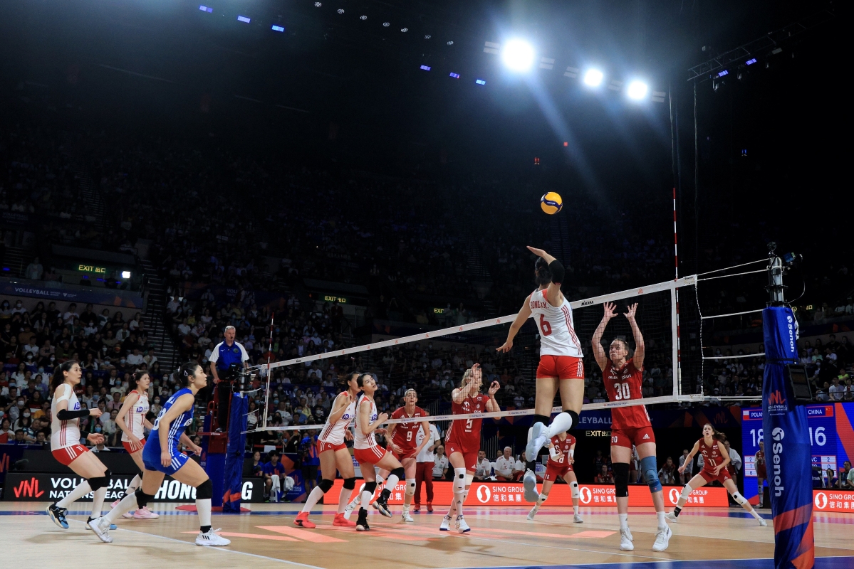 中國女排(白衣)0:3不敵波蘭女排(紅衣),這是中國女排本次世聯賽首場失利