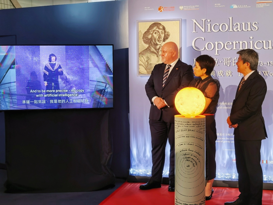 除各位主禮嘉賓外,本次開幕典禮還迎來了一位特別嘉賓:哥白尼。 香港太空館別出心裁地打造了哥白尼人工智能(AI)化身,以視頻的形式參與此次開幕禮,來紀念其550周年誕辰。 哥白尼AI以俏皮的口吻介紹了自身的生平、研究領域及其所做出的貢獻,為新專題展覽所涉及的主要內容進行了總結。