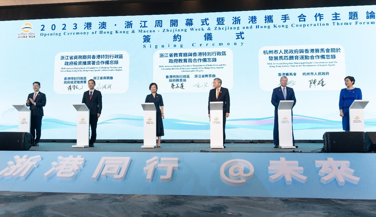 香港賽馬會與杭州市政府簽備忘錄探討馬匹體育運動合作香港新聞網6月26日電 香港賽馬會6月26日與杭州市人民政府在香港簽署合作備忘錄,以進一步加強杭州與香港的合作,共同推動國家馬匹體育運動發展。 合作備忘錄的簽署儀式在“2023港澳∙浙江周開幕式暨浙港攜手合作主題論壇”中進行,并在香港特別行政區行政長官李家超及浙江省省委書記易煉紅的共同見證下,由杭州市政府常務副市長陳瑾與馬會行政總裁應家柏代表雙方簽署有關文件。