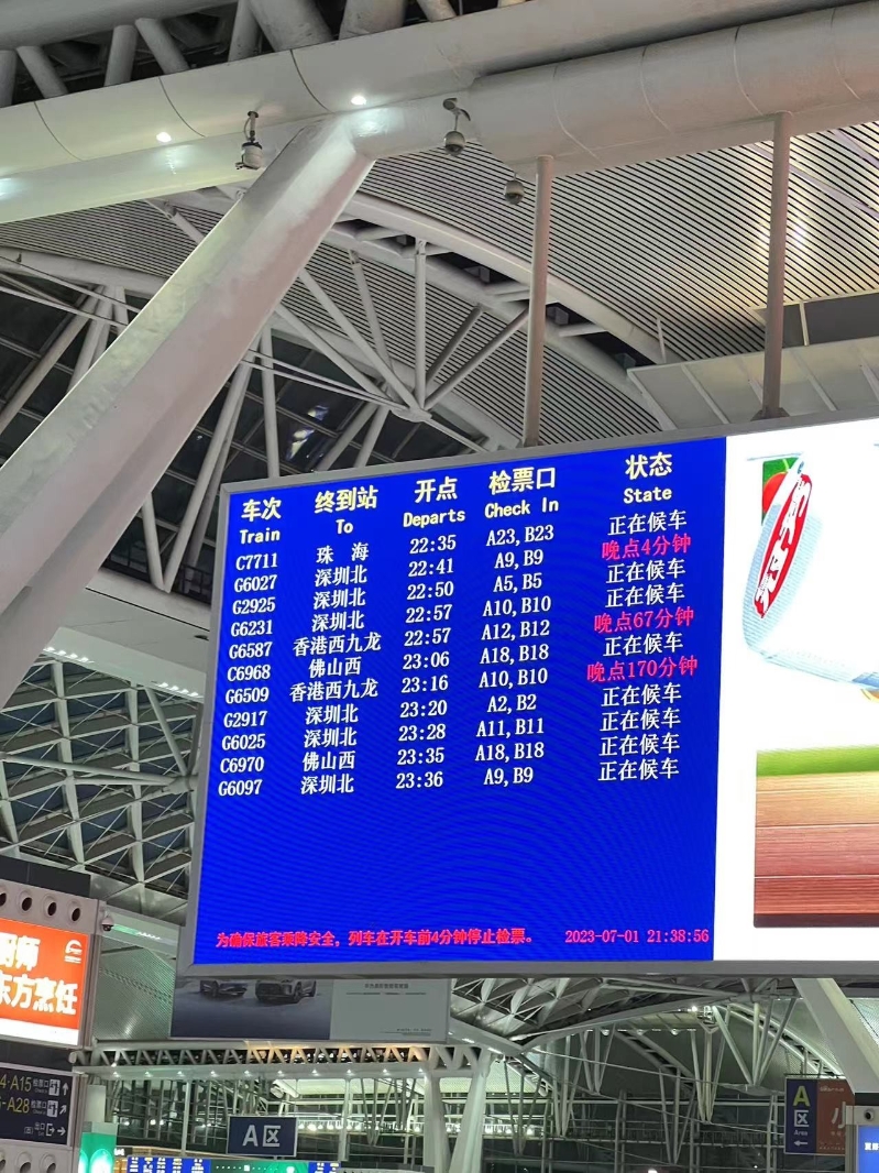 香港新聞網7月1日電 廣深港高鐵西九龍站7月1日信號故障,多班列車延誤或取消。香港中通社記者從廣州南站返回香港西九龍,車次晚點約兩個小時,現場大批乘客可退票並搭乘往深圳列車,上車補票。