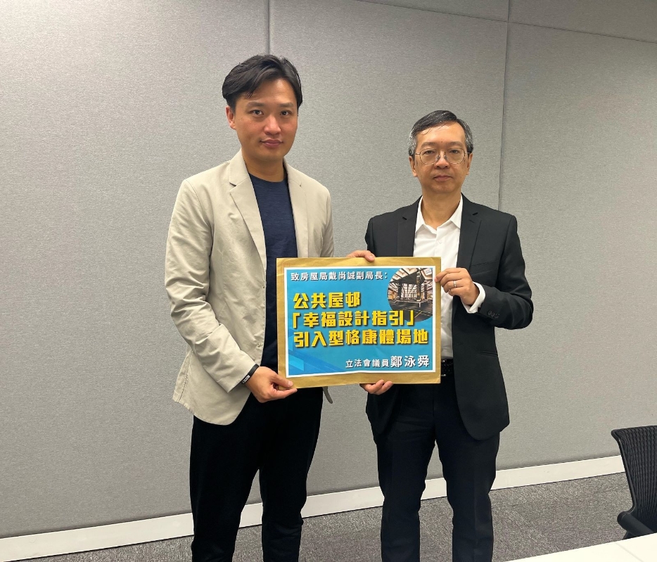 香港新聞網7月4日電 香港去年發表施政報告,建議為公營房屋制訂“幸福設計”指引,並挑選現有五條屋邨作出大改造,以作為先導計劃。房屋局即將為此展開公眾諮詢,民建聯立法會議員鄭泳舜4日約晤房屋局副局長戴尚誠,倡議為公營房屋引入“幸福設計”指引,必須包括健康活力元素,翻新美化屋邨球場等康體場地,並新增更多健身設施。