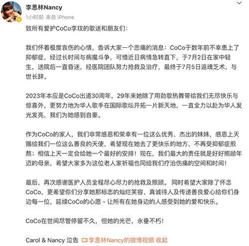 李玟微博圖片。 李玟離世的消息震驚兩岸三地,內地社交平台隨後瘋傳一段李玟生前給粉絲的錄音。她在錄音中表示:“親愛的,我是CoCo,感受到大家對我的愛跟支持,然後你們做我的後盾,我會加油。這段時間希望你們自己身體健康快樂,我非常想念大家,我在努力努力,想念你們,我也非常想念你們,愛你愛你。” 不少歌迷湧入李玟的微博留言悼念,指“天堂沒有抑鬱症,感謝你來過,謝謝你帶給我們的歌聲,一路好走”、“希望你到了天國後可以丟掉所有抑鬱的情緒,做你想做的事”、“妳依然是那個勇敢的女戰士”。(完)