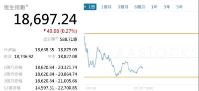 香港新聞網7月14日電 美國最新出爐的生產物價指數(PPI)進一步顯示通脹壓力紓緩,美國債息大幅回落,美股周四造好,納指急升超過1.5%。港股連升四日累漲近千點後,14日早高開近1%後回順。恆指中午收市報19399點,升49點或0.25%。大市成交額為518億港元。